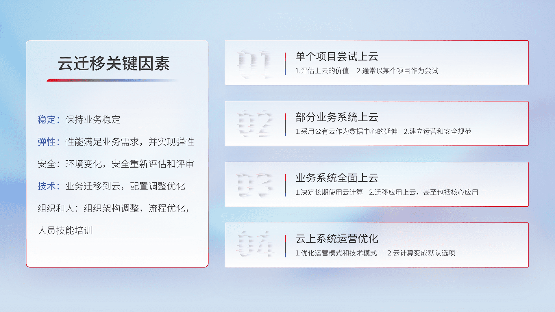 结合实际业务,,从规划设计、、、云平台选型、、、、云原生改造、、、、数据迁移、、集成交付,,迁移全过程为客户识别最佳上云路径,,,,做好风险识别管理,,设计网络架构、、、身份权限、、、、安全审计合规、、操作审计、、日志审计、、、、监控告警策略、、多站点容灾设计等,,对云上基础设施进行整体规划,,,提升IT治理水平,,,,以满足弹性、、、、高可用、、、高性能的需求。。。。