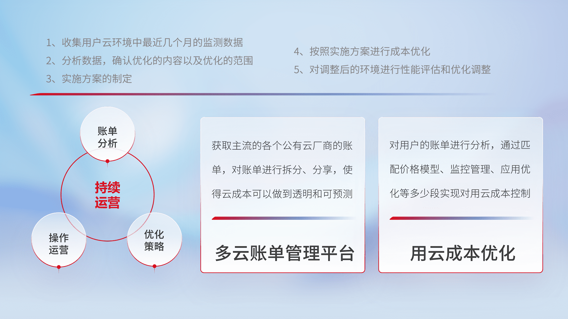 通过多云纳管,,,以统一的资源数据模型把客户的云资源进行抽象和封装,,,进而实现对多云资源的统一操作,,,保障云资源管理的可靠性、、、、稳定性与可用性。。量身定制化运维内容,,,配置、、、开发运维、、补丁管理、、、备份、、监控、、、认证和访问管理、、、、审计和日常巡检等,,,,保障在用云过程中的可靠度,,稳定度以及高可用率。。。
